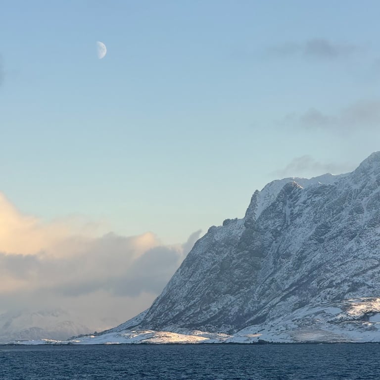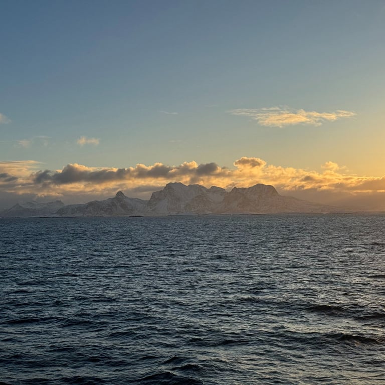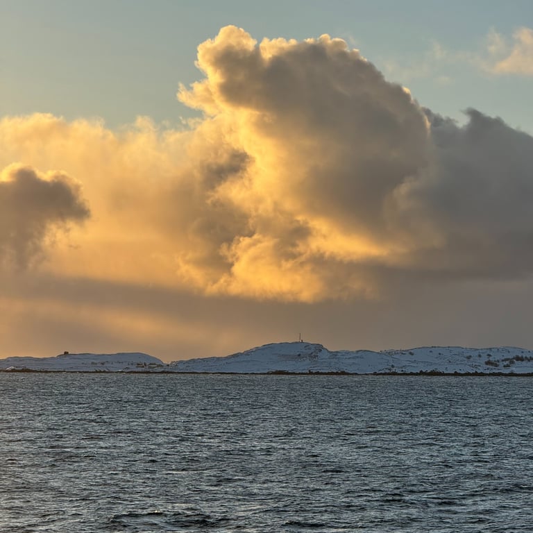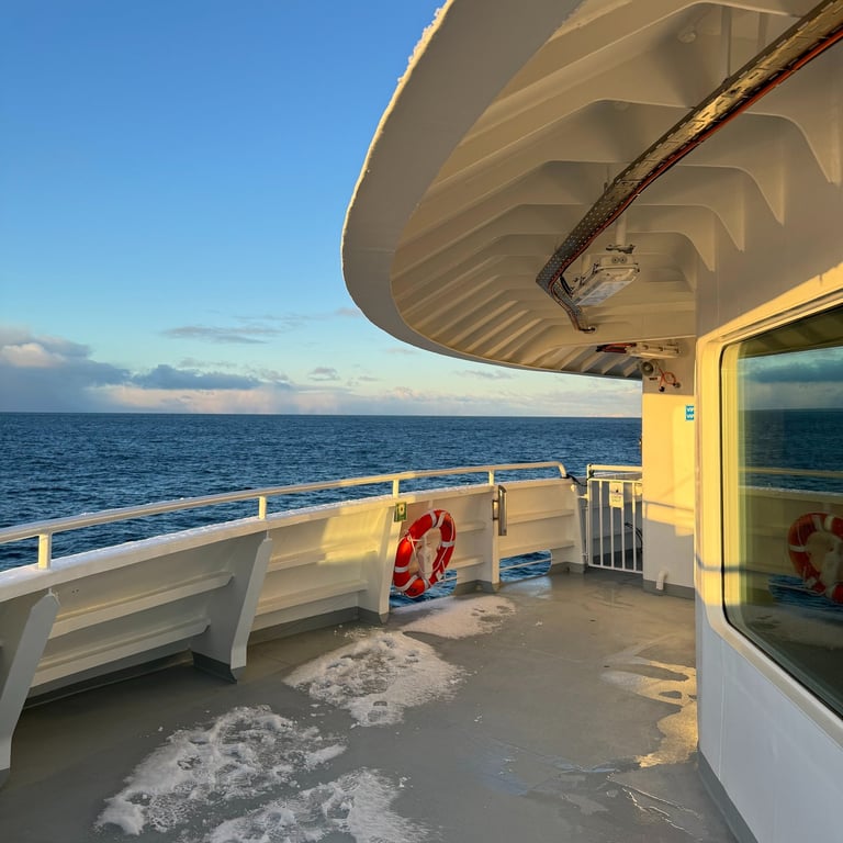 Wir starten heute früh, bereits um 6 Uhr schaufeln wir das Auto frei, denn es hat nachts wieder geschneit. Die Fahrt zum Fährhafen verläuft trotz schneebedeckten Strassen gut und die Fähre fährt pünktlich um 07:00 ab. Zu dieser Zeit haben wir bereits bequeme Sitzplätze am Fenster eingenommen und freuen uns auf die Fahrt, denn wir fahren in den Sonnenaufgang! In Bodo geben wir das Mietauto zurück und checken unser Gepäck ein. Die Sicherheitskontrolle ist sehr spärlich bevölkert, wir sind die einzigen, die geprüft werden und natürlich wird Nicolas’s Rucksack aufgrund der vielen Kameras wieder gesondert gecheckt.