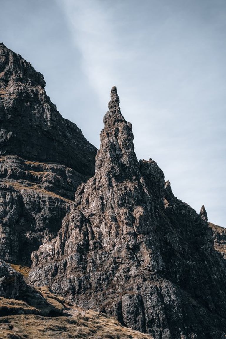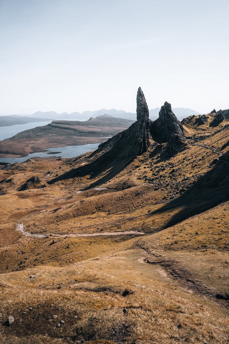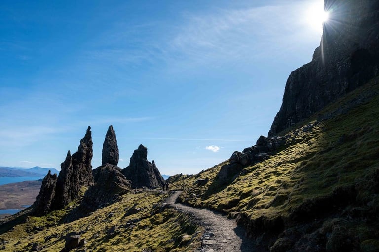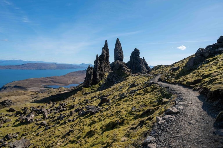 After our visit to the castle, we continue on to the Isle of Skye and make our way to the Old Man of Storr. It's an impressive experience to see the stunning landscape and the striking rock formation, but it's also very windy and somewhat strenuous on the hike.