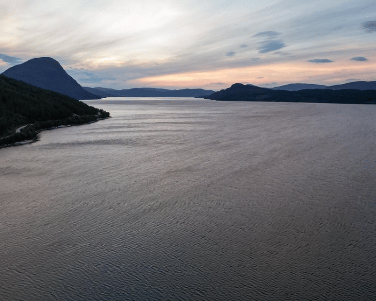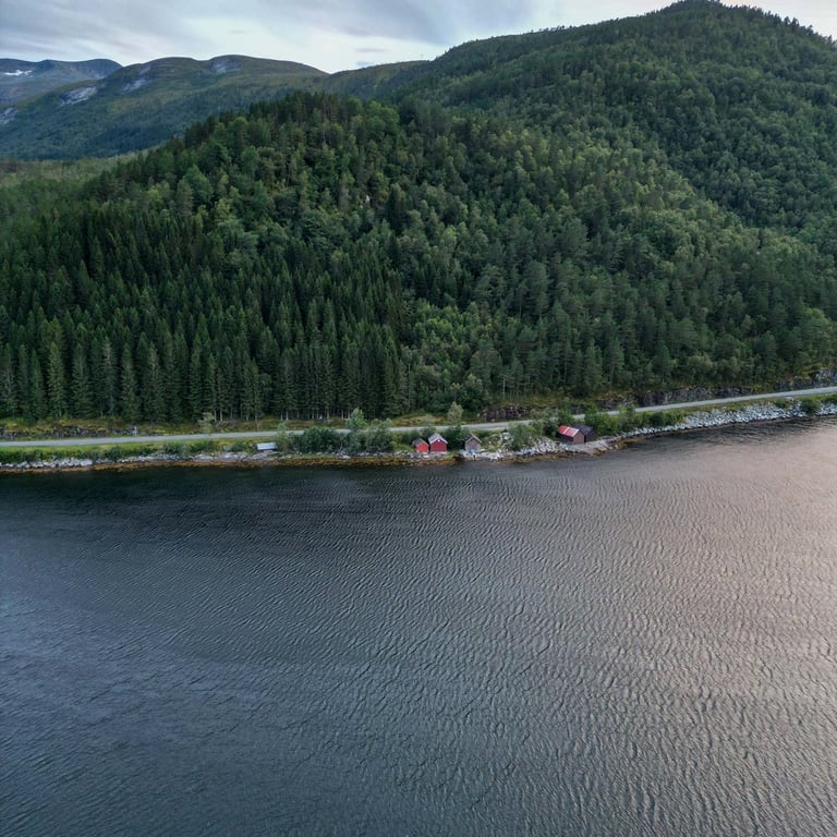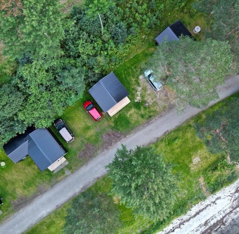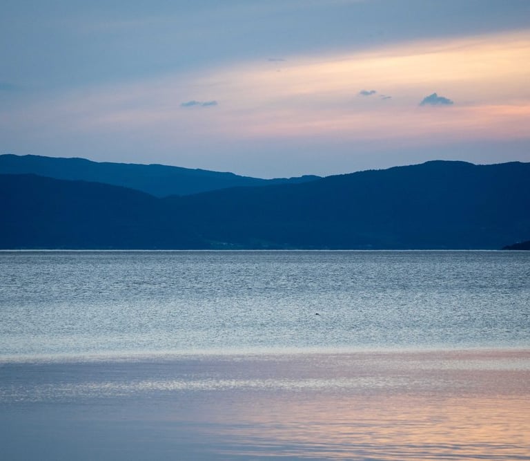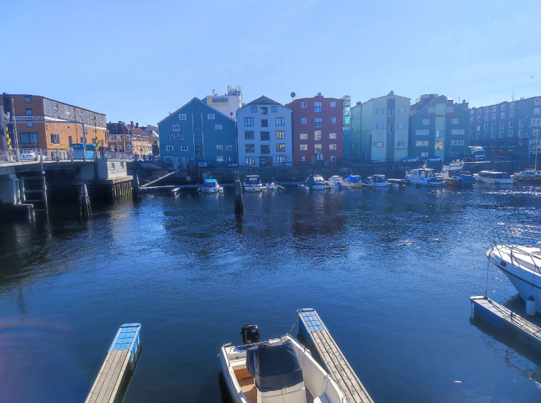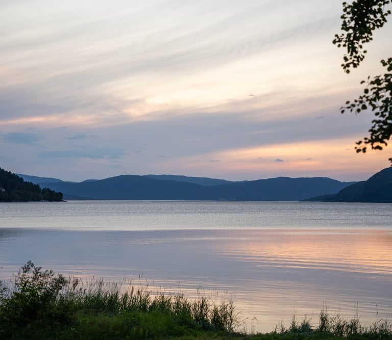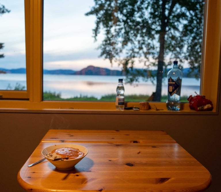 We arrive in Trondheim and walk to the Avis car rental, which hands us our rental car. A Honda Jazz Hybrid - not exactly the most stylish car, but it has an automatic with distance cruise control and hybrid. We don't need much more for this short time. We take turns driving and drive through to Ålvund, where our accommodation is for the night. We sleep at a campsite, but in a cabin right by the fjord. The sunset right by the sea, to which we have our dinner, is stunning.