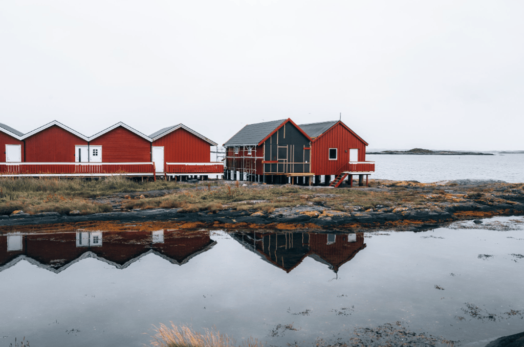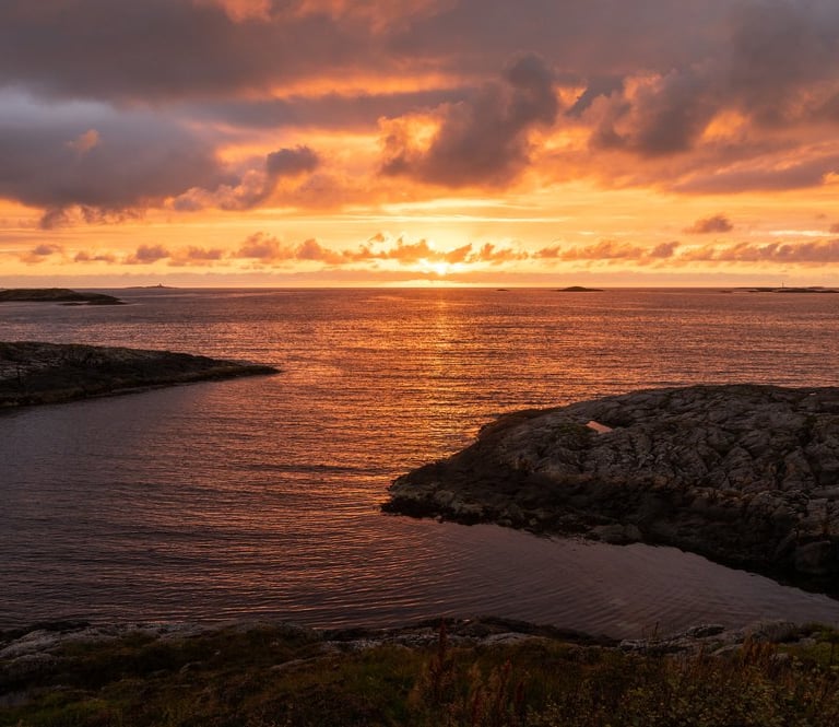 The day today unfortunately starts with cloudy skies and drizzle. We eat breakfast in our bungalow, pack our things and head west to the coast. We have chosen a way without a ferry, but it takes a little longer, because we have to drive all around a fjord. But when we pass the ferry, it just stops and waits to be loaded. Spontaneously we decide to take the ferry across the Langfjorden as well. The trip doesn't take long, after 20 minutes we are already driving on a normal road again. On the west coast in Bud there is a Coastal Trail, which we would like to walk along. Typical red Norwegian cottages can be found along the coast.