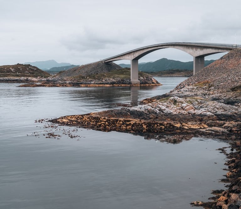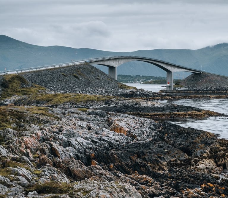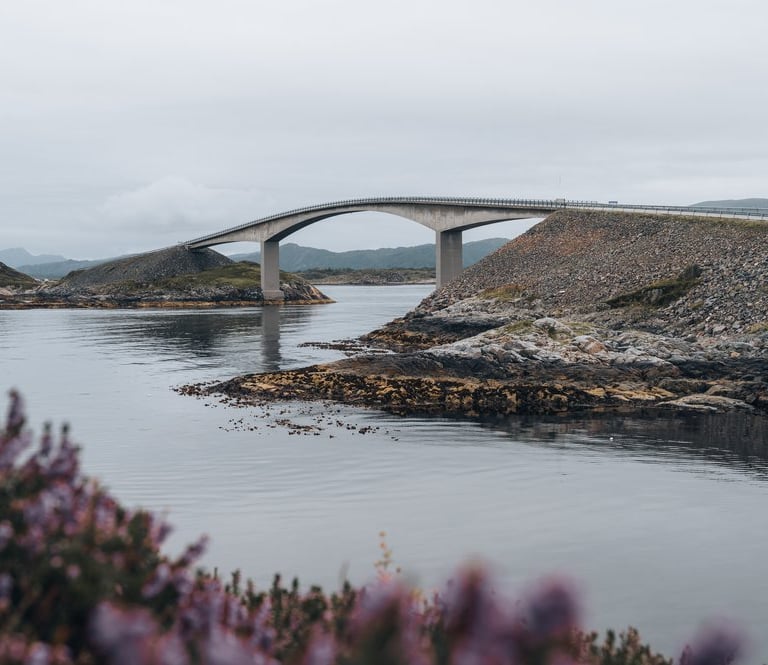 Unfortunately the weather is not so good today, so we shorten the trail and eat our lunch in the car. We continue to the next Coastal Trail in Farstad. The weather looks a bit better. Nevertheless, we strap on our rain jackets and walk to Farstadsanden, the beach of Farstad. We walk along the coast and enjoy the view of the open sea. A bit chilled out, we return to the car and drive the last few minutes to our next accommodation in Vevang. The Airbnb is well equipped and very spacious. We unload our luggage and drive to the nearby Atlantic Ocean Road. This stretch of coastline is known for its film location from the latest James Bond movie, No time to die. The small islands are connected with bridges, which offer a spectacular view. We stop at several viewpoints and marvel at the Storseisundbrua from all sides. The striking structure is part of the eight-bridge Atlantic Road in Lauvøyfjord, which is part of the Norwegian Landscape Routes. It bridges the Storseisund and is the largest of the eight bridges.