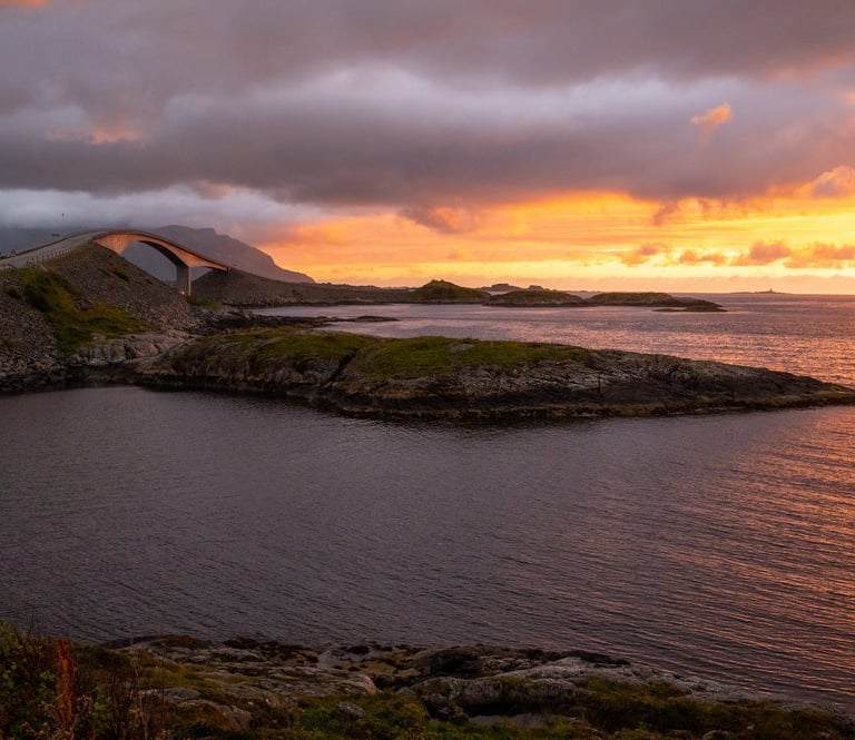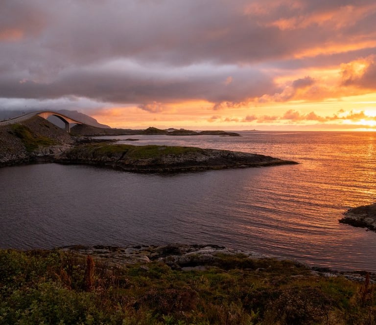 The weather is overcast but at least it is not raining. After an extensive photo and drone session we go to the accommodation and have dinner. After dinner, we are sitting comfortably at the kitchen table looking at our photos when we see the cloud cover break and the landscape is bathed in reddish sunlight. Not hesitating two seconds, we frantically grab our cameras, run to the car and drive as fast as we can to Storseisundbrua again to see the Atlantic Ocean Road at sunset. And we arrive not a second too soon. The last rays of sunlight illuminate Storseisundbrua and turn the whole sky red. The sea glistens in the setting sun. Gleaming sunlight floods the Altlantic Ocean Road. This sunset is definitely one of the most beautiful we have ever seen. Inspired, we drive back to our accommodation.