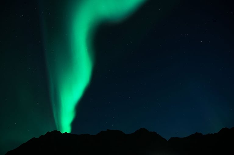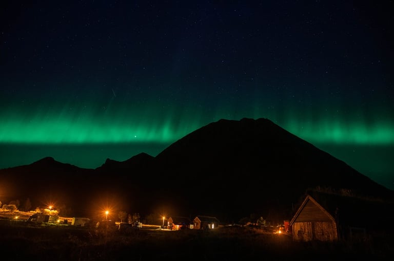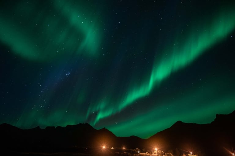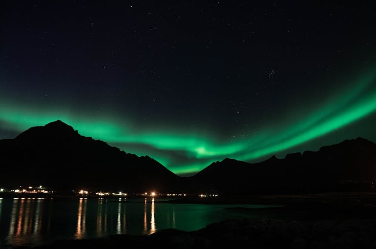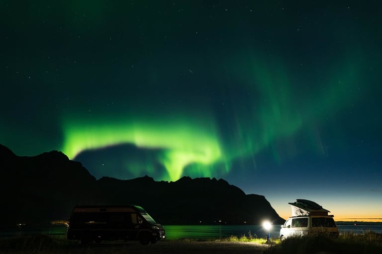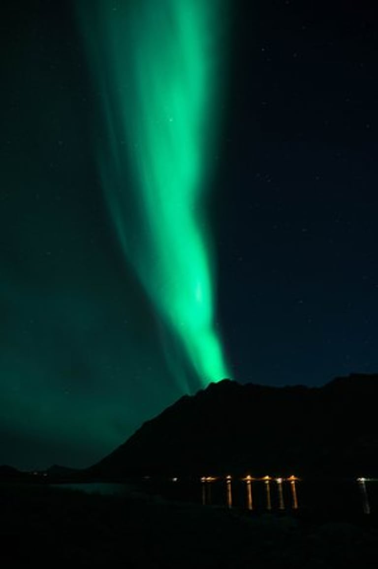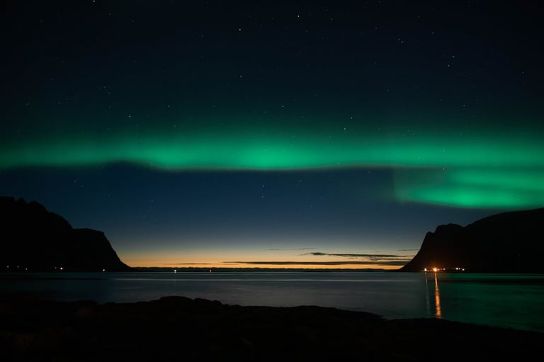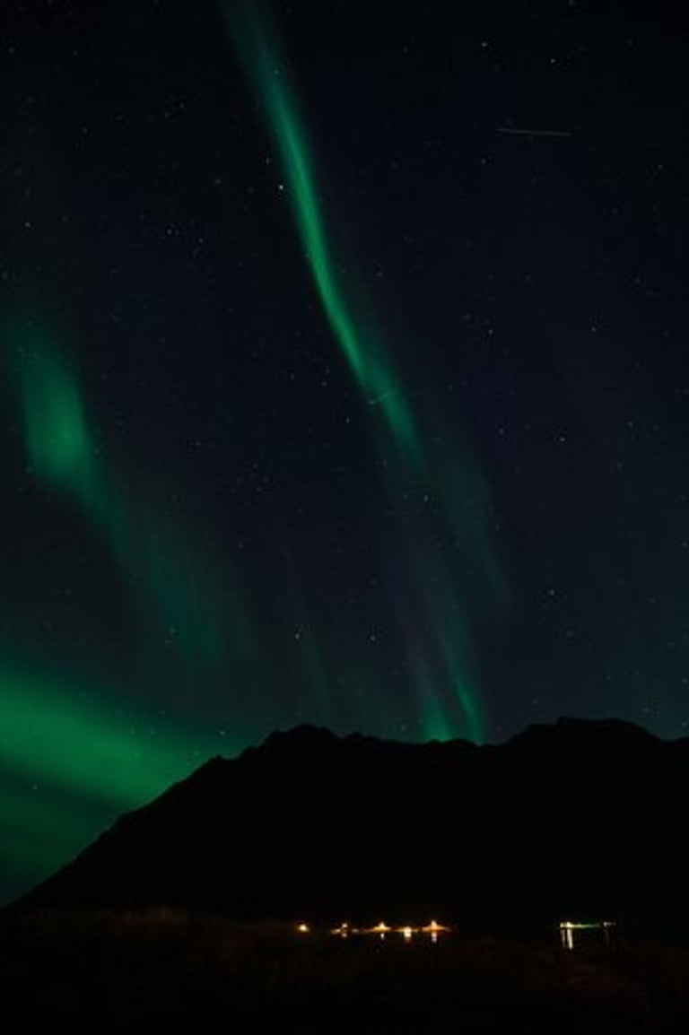 In the evening we arrive at our Airbnb, which is very large and modern. We have dinner first (spinach and cheese tortellini, our traditional vacation dish) and set up our cameras again for northern lights. We drive to the nearby Rystad Camping, where we stayed last year. The northern lights are not long in coming. The camp is surrounded by mountains and sea with a beautiful beach, the perfect place to go Northern Lights hunting.