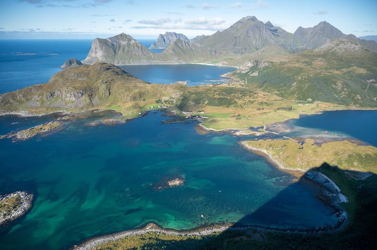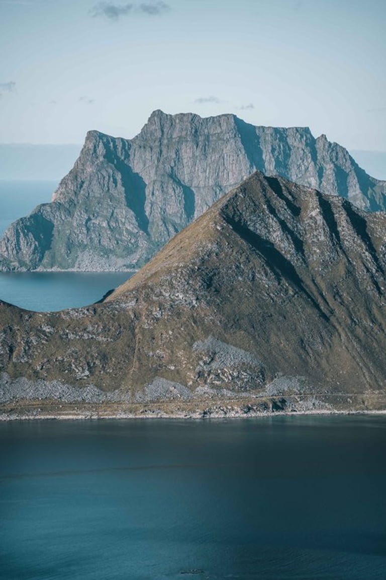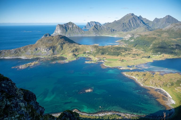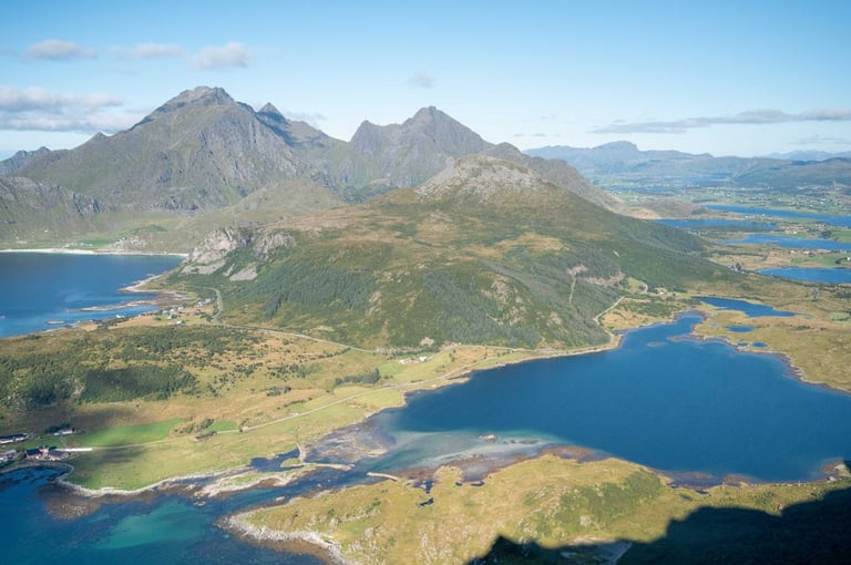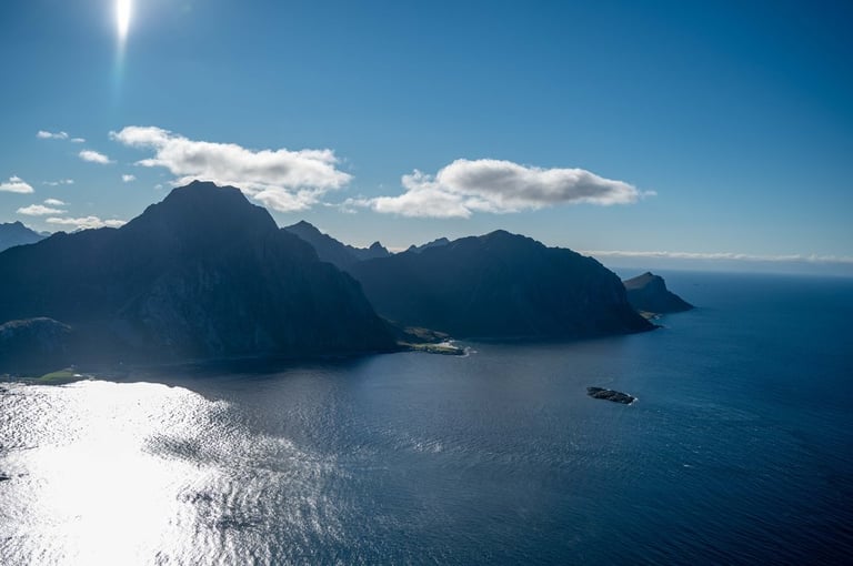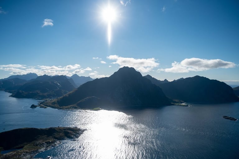 But we can also look forward to our next stop, we want to do the hike to Offersøykammen again. Last year we did this hike under cloudy skies and then realized at the top that we forgot the batteries for the drone. We now want to make up for this mistake. The trail is again very steep, but we arrived at the top of the 436-meter mountain in an hour and a half. And the view up there is just indescribable. 360 degrees completely around us are mountains, islands and the sea to see. There are hardly any other people up here. The sun shines on mountains lying around and the sea shimmers light blue around the islands. We choose this hike as our favorite hike in Lofoten.