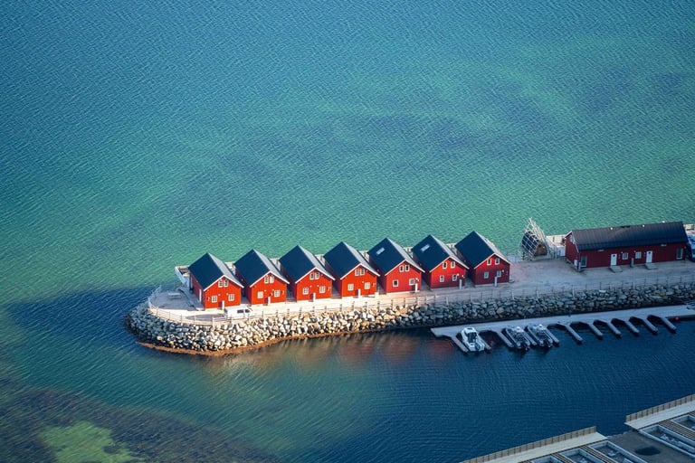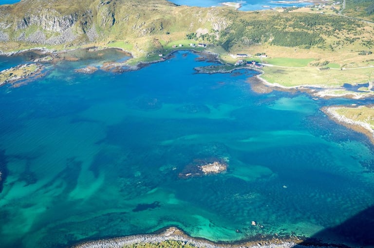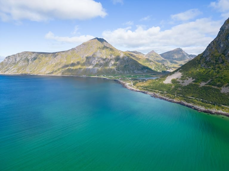 Not only do we like it here very well but also the animals do as we see a large shoal of fish and some jellyfish floating in the sea in front of our beautiful accommodation in the morning. Unfortunately, this is already our last day in the south of Lofoten. We check out and drive one last time to Hamnøy and Sakrisøy. Sakrisøy we go to Anita's Seafood Restaurant and get a Kanelsnurr and a coffee to go. With heavy hearts we say goodbye to Sakrisøy and Hamnøy - our favourite places, go once again to the bridge at Hamnøy to the viewpoint and then leave the south of Lofoten. The weather is once again beautiful. In Ramberg we stop at Bunnpris and also shop once again in the Lofotenstore.