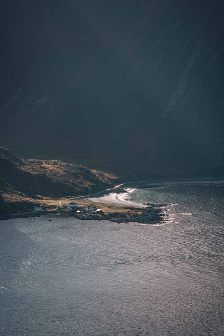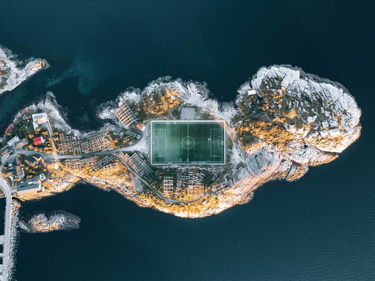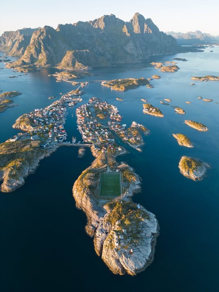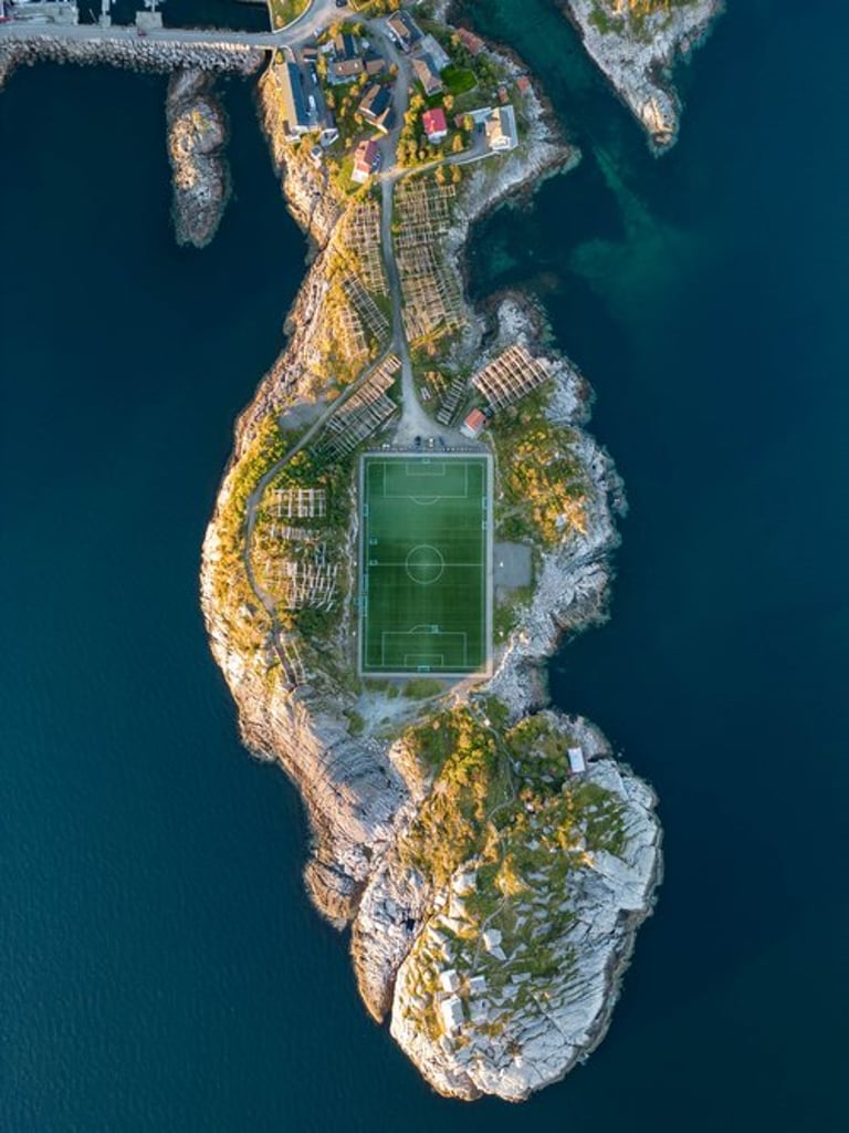 For a while we are completely alone on the mountain, we take the opportunity and make some drone shots. The videos are just going to be epic. We picnic before hiking down and then drive to Henningsvær. On the way we buy groceries. In Henningsvær we arrive in time for sunset. The drive was beautiful and took us past bays and beaches. At the outermost point by the soccer field we stop and take drone shots again and enjoy the sunset over the sea.