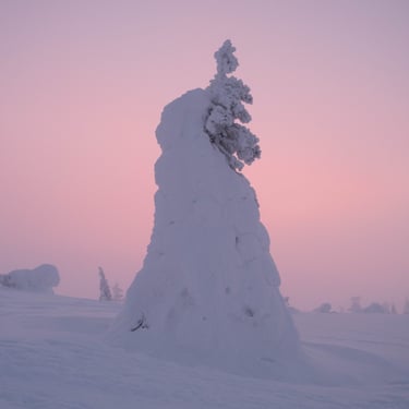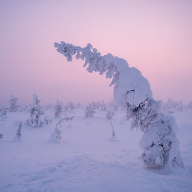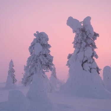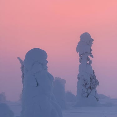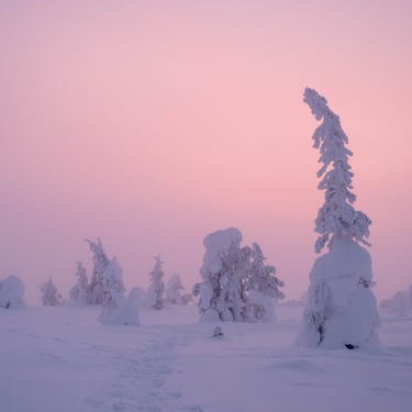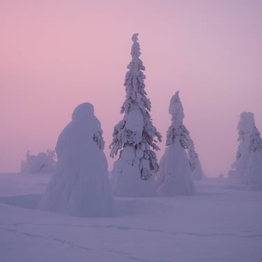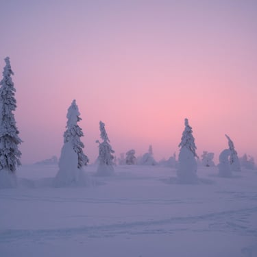 Heute gehen wir den Tag langsam an. Nicolas macht an einer Erkältung rum und wir holen in der Apotheke (welche nur ein kleiner Medizinschrank im nächstgelegenen Supermarkt ist) was dagegen. Nach dem Mittagessen in unserer Unterkunft fahren wir zum gleichen Ziel wie gestern Nachmittag: Zum Riisitunturi Nationalpark. Unterwegs fahren wir noch an einen Autounfall ran, auf der schneebedeckten Fahrbahn kam es zu einer Frontalkollision. An beiden Autos sah es nach Totalschaden aus, doch zum Glück wurde niemand ernsthaft verletzt und die Involvierten lehnten auch unsere Hilfe ab. Danach fahren wir deutlich vorsichtiger bis zum Riisitunturi Parkplatz. Heute sieht es wolkiger und nebliger aus wie gestern und wir sehen kaum was von der untergehenden Sonne, als wir um 15:40 ankommen. Wir starten die Wanderung sofort und hasten bis zum Ziel hoch. Ausser Atem kommen wir an, doch uns bietet sich ein unglaubliches Spektakel! Der Himmel und Schnee sind durch die im Nebel untergehende Sonne rosa gefärbt. Wir geniessen das Spektakel, sofern das bei erneuten -25 °C als geniessen eingestuft werden kann… Unsere Wimpern sind eingefroren doch für die Hände und Füsse haben wir heute mit neu gekauften Wärmepads vorgesorgt, welche schön warm geben. Wir fotografieren natürlich das gesamte Spektakel und sind sowas von froh, dass wir die Wanderung heute nochmals gemacht haben. Gemütlich machen wir uns wieder auf die 45-minütige Heimfahrt, wo wir natürlich wieder mit einem Saunagang abschliessen, bevor wir zu Abend essen.