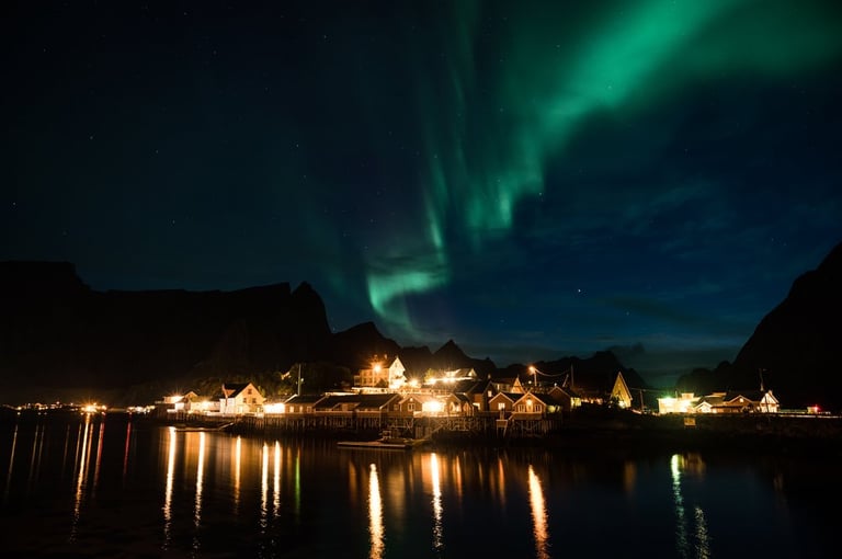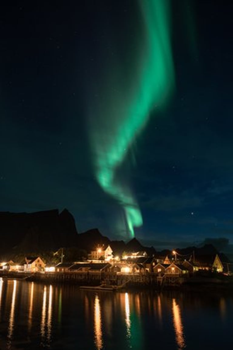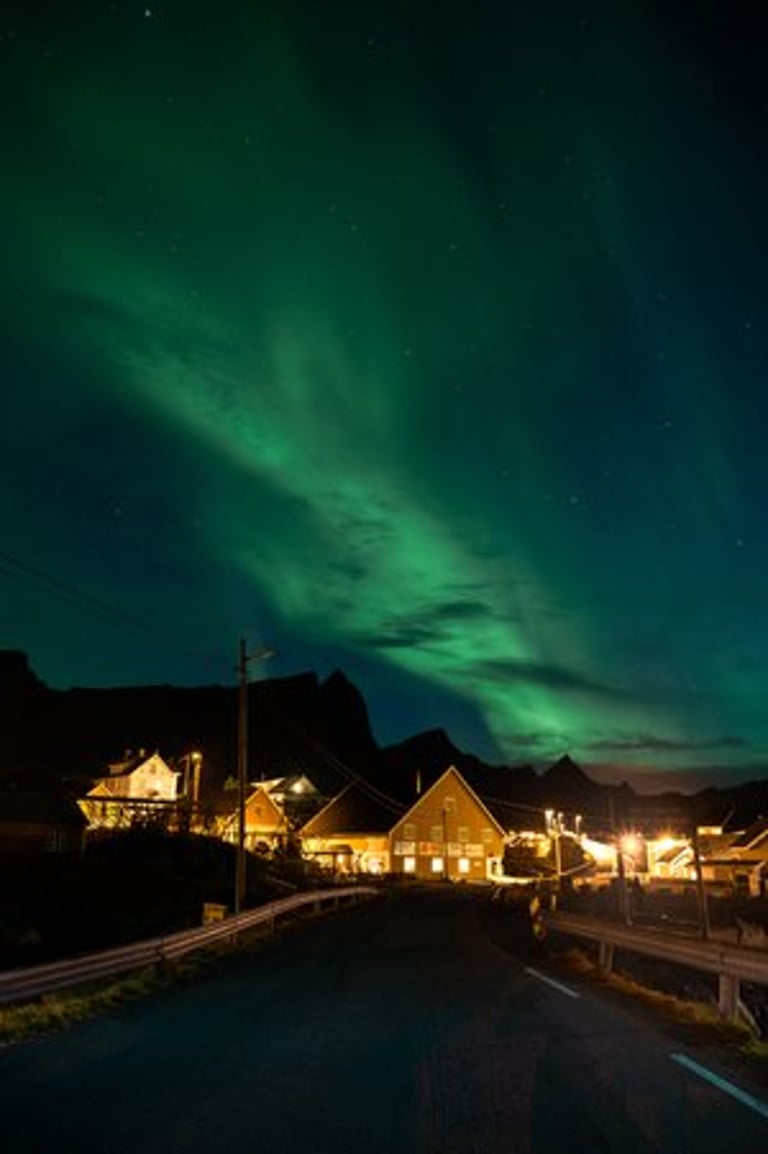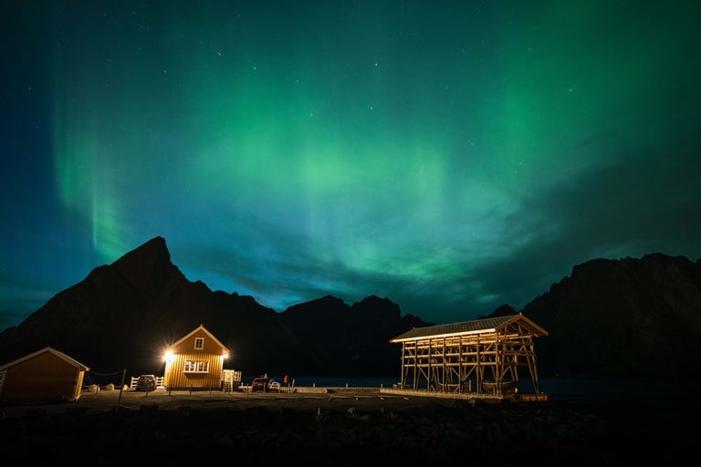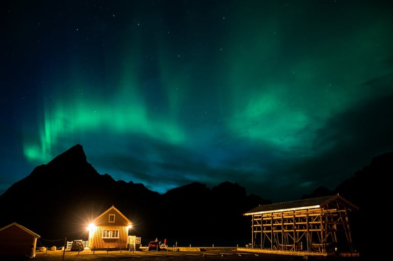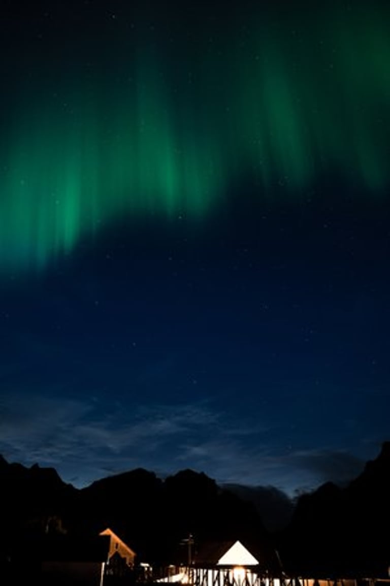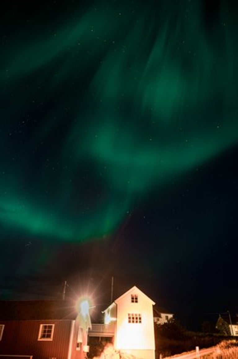 In the evening we have a cozy apero before dinner. Even though we are both tired, we stay awake because we have a small chance of seeing northern lights. It is supposed to get cloudier during the night, but around midnight we would still have chances. So we hold out until it gets dark, Nicolas dares to go out to take a test photo and indeed there are green lights in the sky on the camera, which we can't see with the naked eye yet. And with that it's a done deal, we throw ourselves into warm clothes and leave the cozy warmth. Good, we have already set our cameras before. And the northern lights are not long in coming. Already the sky is covered with green stripes! Alternately, the lights dance across the sky and then stay again a little longer. It is beautiful again, we can hardly believe our luck and take many pictures at different points. Especially in front of the orange houses with the sea in the foreground the northern lights look impressive. The natural spectacle does not last long, because the clouds push themselves in front of the lights. We are amazed that we were privileged to see the well-known and beautiful village of Sakrisøy with northern lights.