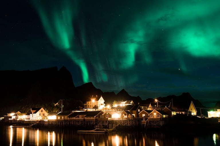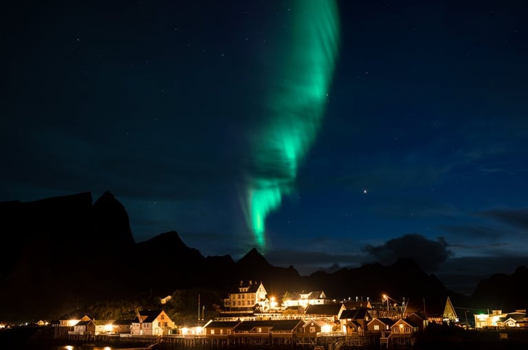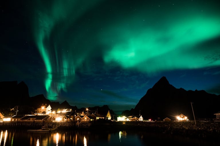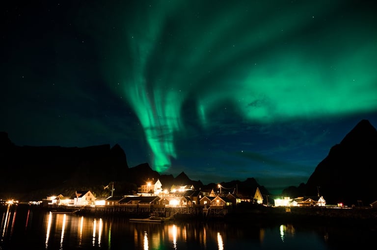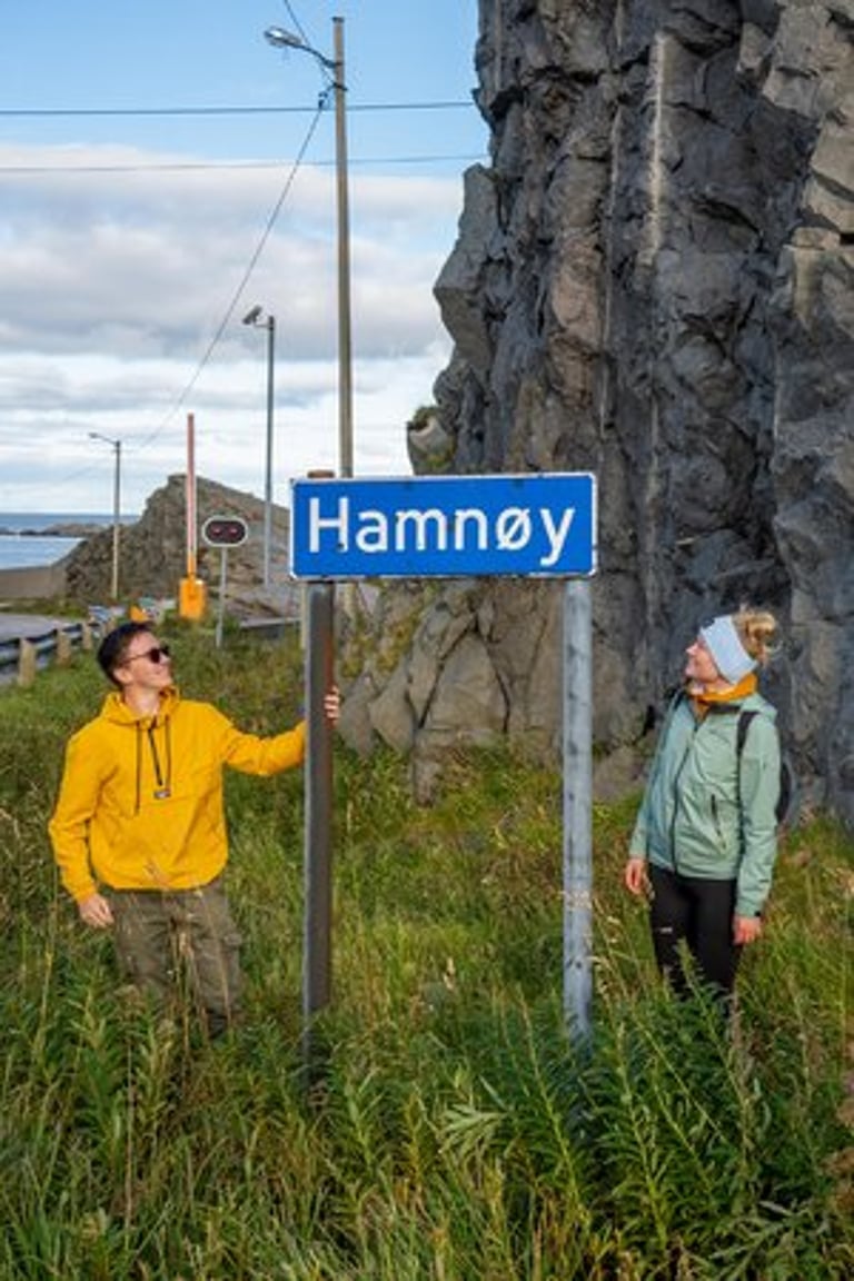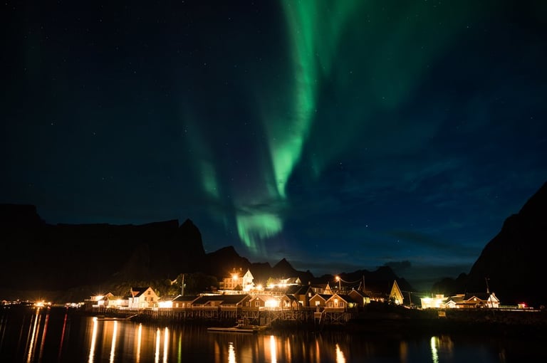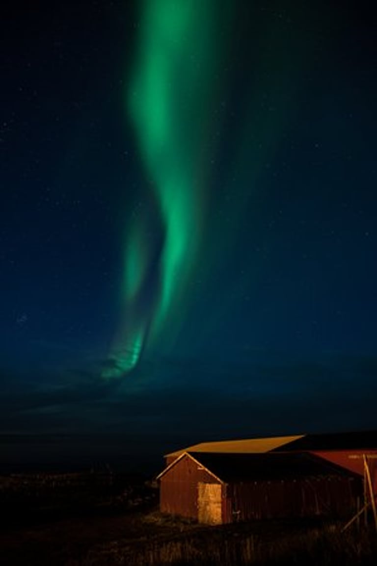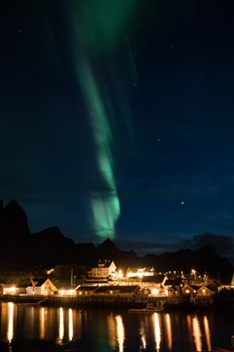In the evening we have a cozy apero before dinner. Even though we are both tired, we stay awake because we have a small chance of seeing northern lights. It is supposed to get cloudier during the night, but around midnight we would still have chances. So we hold out until it gets dark, Nicolas dares to go out to take a test photo and indeed there are green lights in the sky on the camera, which we can't see with the naked eye yet. And with that it's a done deal, we throw ourselves into warm clothes and leave the cozy warmth. Good, we have already set our cameras before. And the northern lights are not long in coming. Already the sky is covered with green stripes! Alternately, the lights dance across the sky and then stay again a little longer. It is beautiful again, we can hardly believe our luck and take many pictures at different points. Especially in front of the orange houses with the sea in the foreground the northern lights look impressive. The natural spectacle does not last long, because the clouds push themselves in front of the lights. We are amazed that we were privileged to see the well-known and beautiful village of Sakrisøy with northern lights.