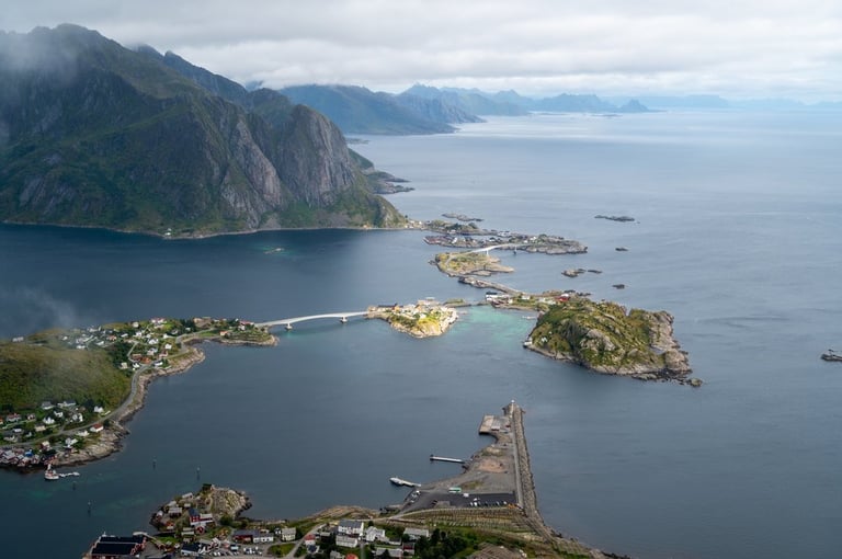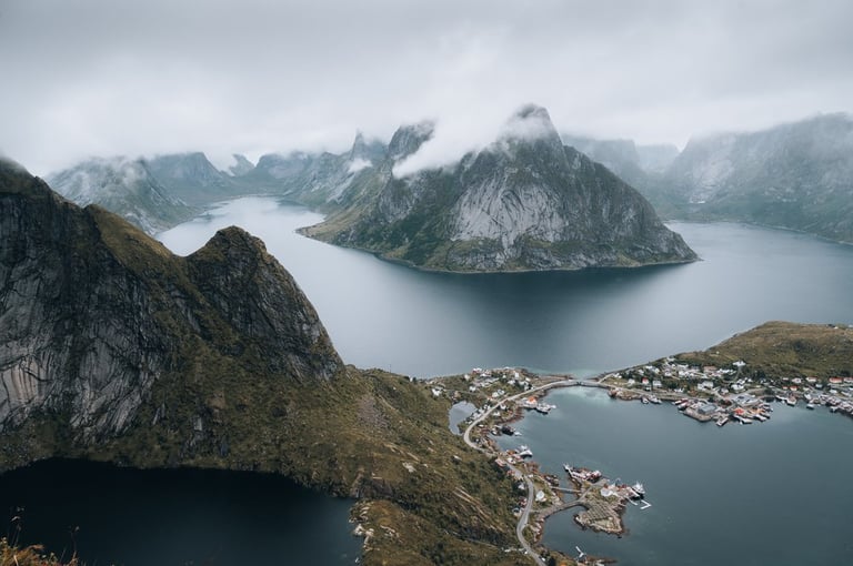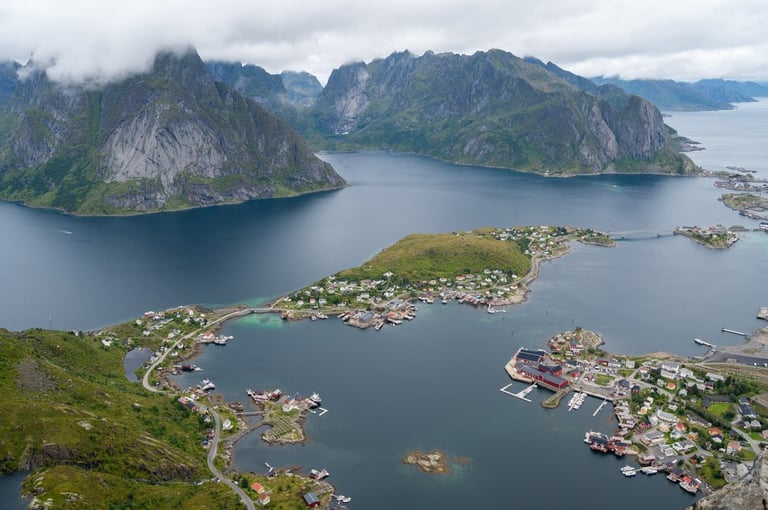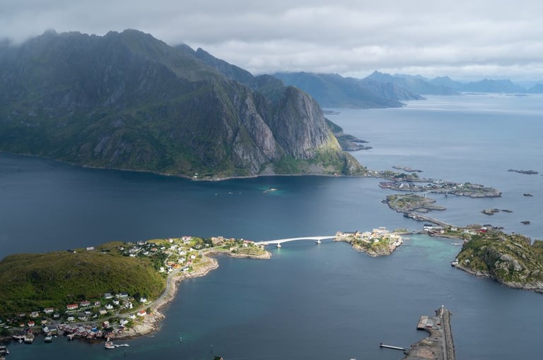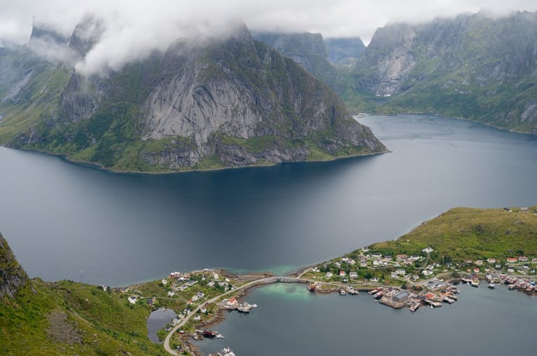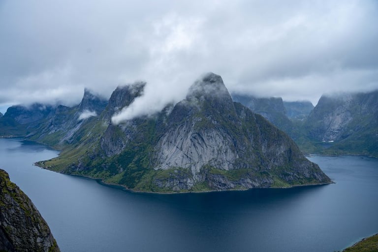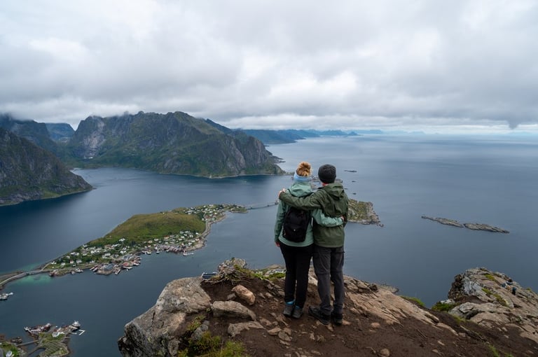 Today we want to climb the Reinebringen, so we leave relatively early for the starting point of the hike, the Steffenakken car park on the E10. From there we walk about 25 minutes to the Reinebringen Trail Head. Over stone steps built by Tibetan Sherpas, a steep path leads to the top of the mountain. On the way and at the top we enjoy the incredible view over fjords, mountains and lakes. We are very lucky with the weather, as it is still sunny for a short moment when we reach the top, just before it becomes increasingly cloudy. We eat our lunch, homemade sandwiches, before we start the descent.
