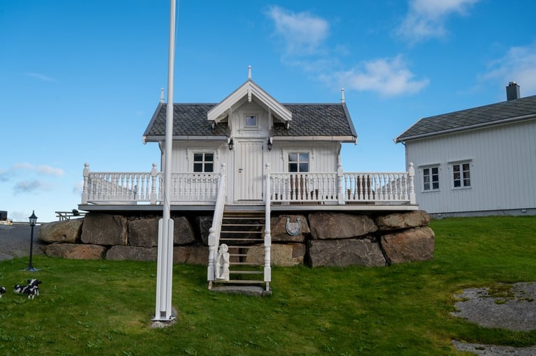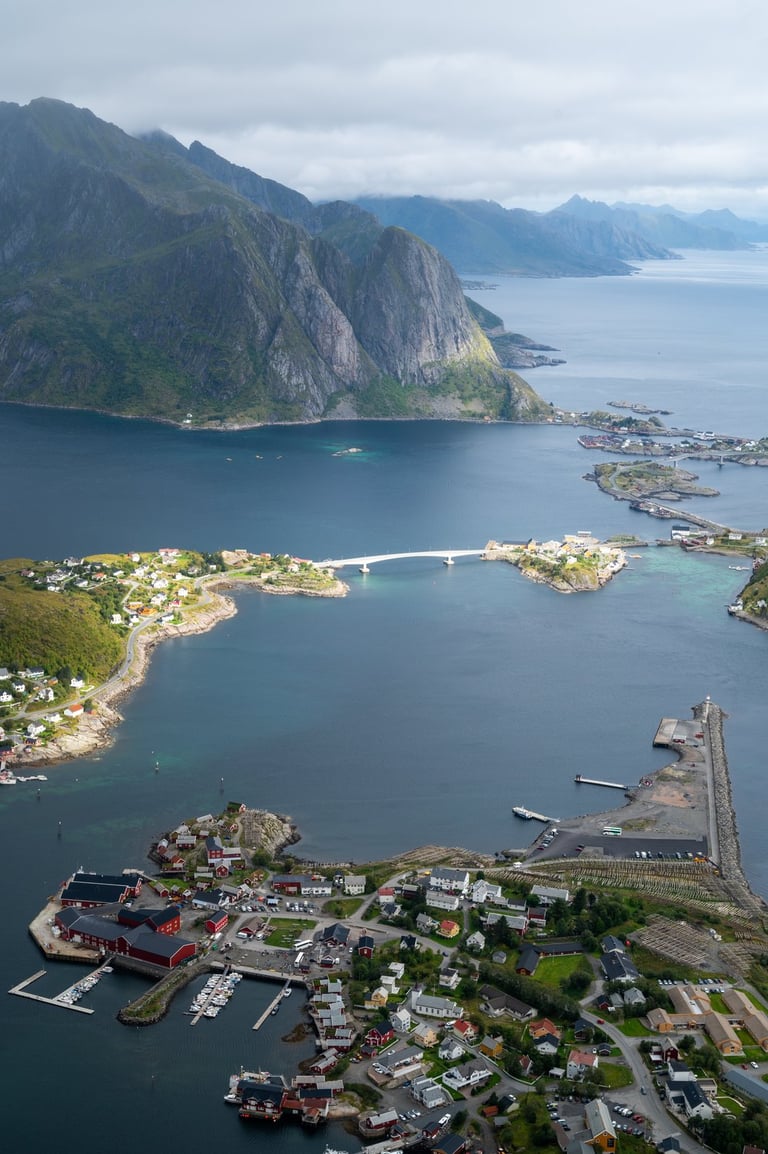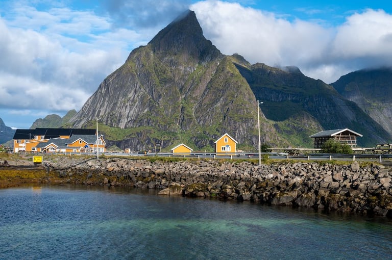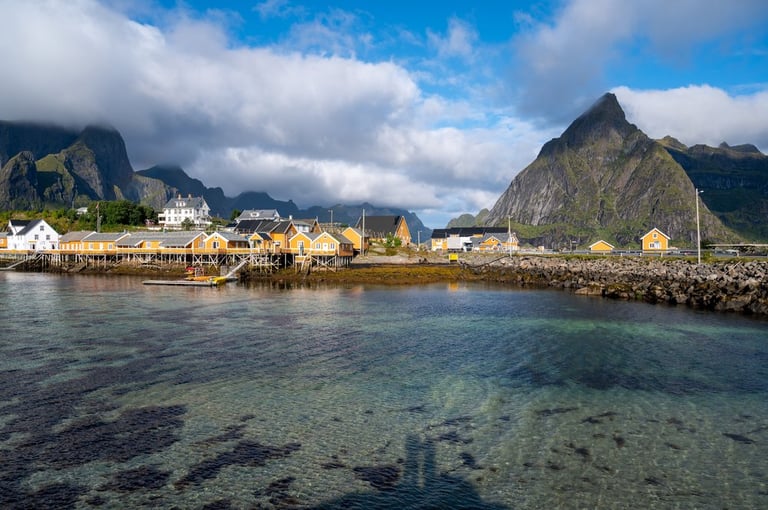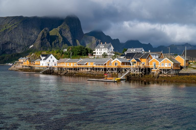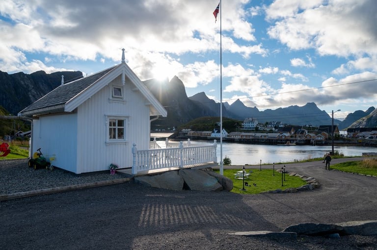 Today we have a delicious breakfast in our cottage and enjoy the view from our mini-villa. We have a view of the beautiful orange houses of Sakrisøy with the fjord arm reflecting the houses beautifully.