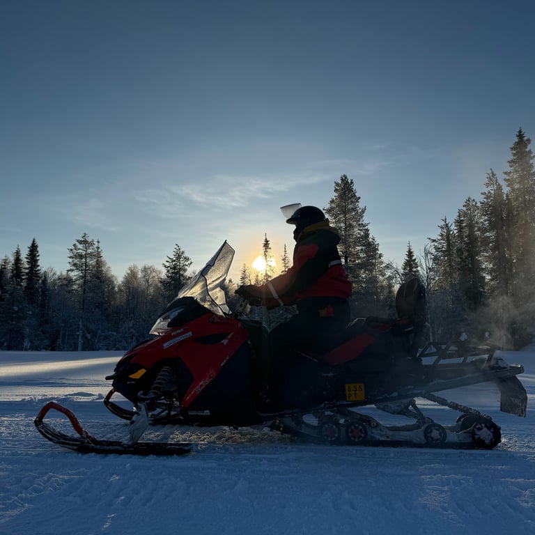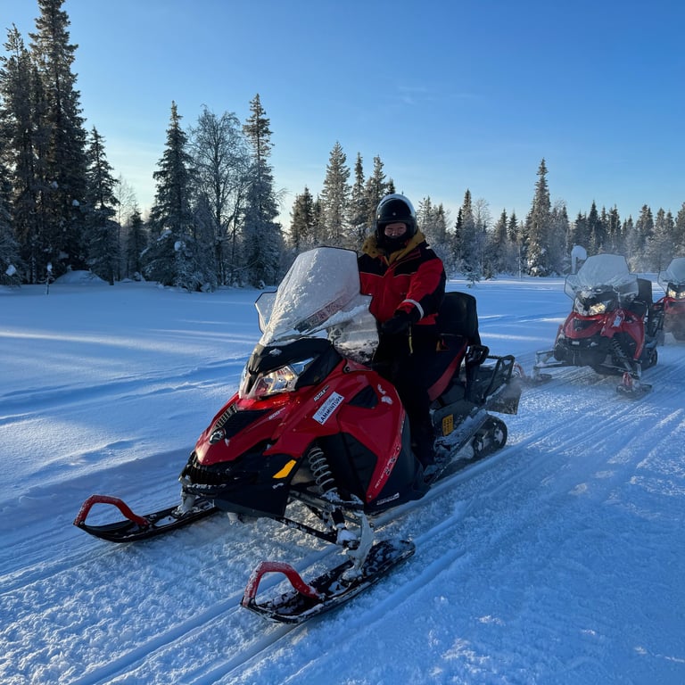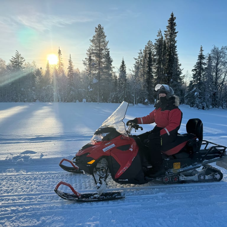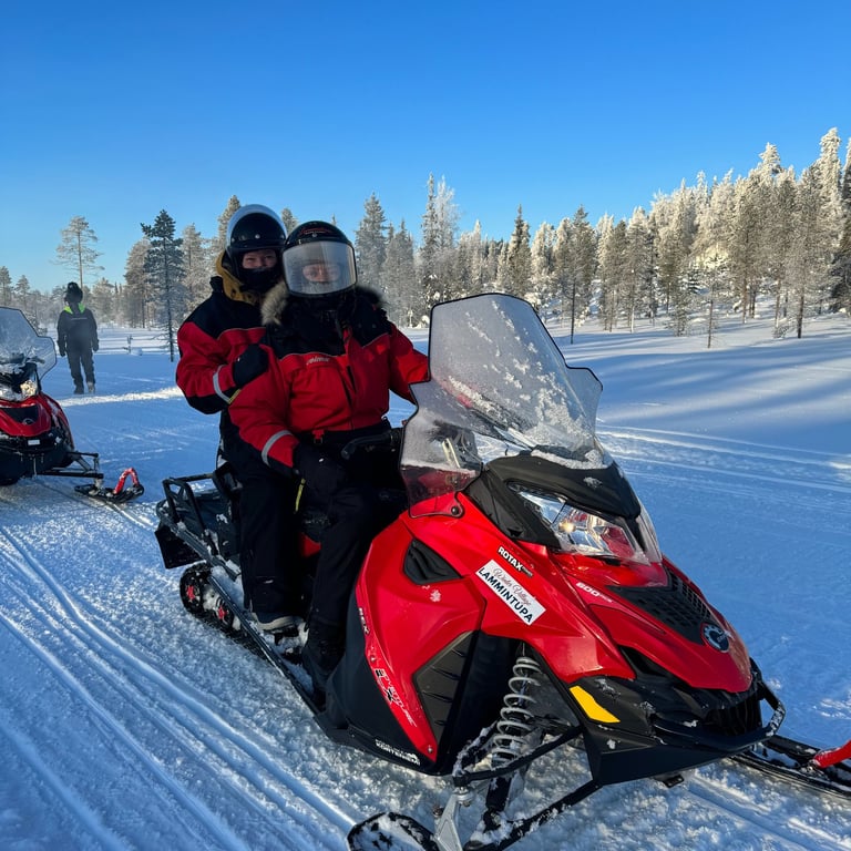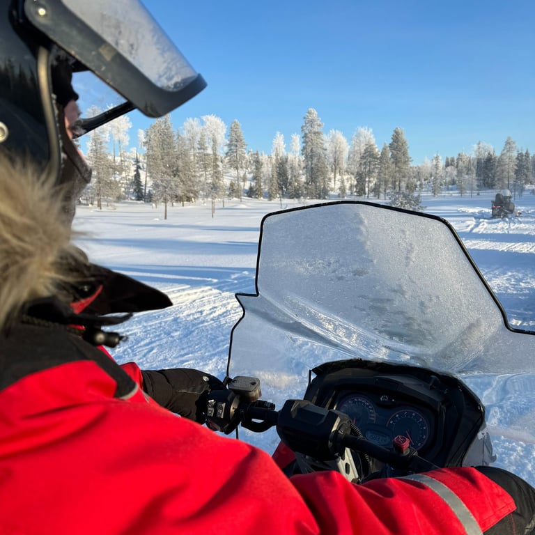 Als wir heute aufwachen, scheint die Sonne schon schön. Heute haben wir was Besonderes vor. Wir wollen Schneemobil fahren und haben uns dafür für eine geführte Tour angemeldet. Diese findet ganz in der Nähe von unserer vorherigen Unterkunft, den Magical Ponds, statt. Als wir dort ankommen, werden wir erstmal mit passender Kleidung versorgt. Wir steigen in dicke Ganzkörper-Winter-Overalls, Balaclavas und Helme. Dann bekommen wir kurz eine Instruktion, wie man Schneemobil fährt. Wichtig sei, dass man beim Lenken nicht den Lenker von sich wegstösst, sondern zu sich zieht. Denn es gibt einen Gashebel am rechten Lenker und wenn man den Lenker wegstossen würde statt ziehen, könnte es mit den dicken Handschuhen sehr gut passieren, dass man aus Versehen den Gashebel drückt und das Schneemobil dann unkontrolliert wegdüst. Wir dürfen uns danach ein Schneemobil aussuchen. Wir entscheiden uns für einen Lynx Adventure LX mit 600 ccm Hubraum. Von aussen sieht es aus wie ein überdimensioniertes Motorrad mit zwei Kufen statt einem Vorderrad. Nicolas fährt und Annina fährt bei. Es ist ein ganz spezielles Gefühl, damit zu fahren und komplett anders als mit dem Auto auf verschneiten Strassen zu fahren und auch komplett anders als mit dem Motorrad zu fahren. Es braucht deutlich mehr Kraft, das Ding durch den Schnee zu lenken und es fährt sich sehr schwammig und reagiert nur träge auf Lenkbewegungen, dafür umso schneller auf Bewegungen am Gashebel. Wir fahren in einer Kolonne, zusammen mit den anderen Reiseteilnehmern und den zwei Guides. Die nächsten 1.5 Stunden fahren wir insgesamt 30 Kilometer durch wunderschön verschneite Wälder und über zugefrorene Seen. Die Sonne strahlt und lässt den Schnee wie Diamanten glitzern. Meist fahren wir auf markierten Schneemobilpfaden, teils aber auch etwas abseits. Heute haben wir zwischen -25 bis -30 Grad und gegen Ende der Fahrt ist das Visier des Helmes komplett vereist und um noch etwas zu sehen, müssen wir es hochklappen, was dann in zugefrorenen Wimpern und Gesichtern resultiert. Es ist ein richtiges Abenteuer, das wir danach mit den restlichen Tourteilnehmern und den Guides in einem Schnee-Tipi-Iglu an einem Feuer mit warmem Essen und Getränken abschliessen.