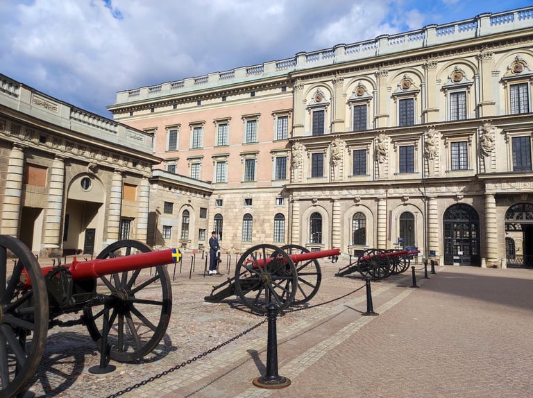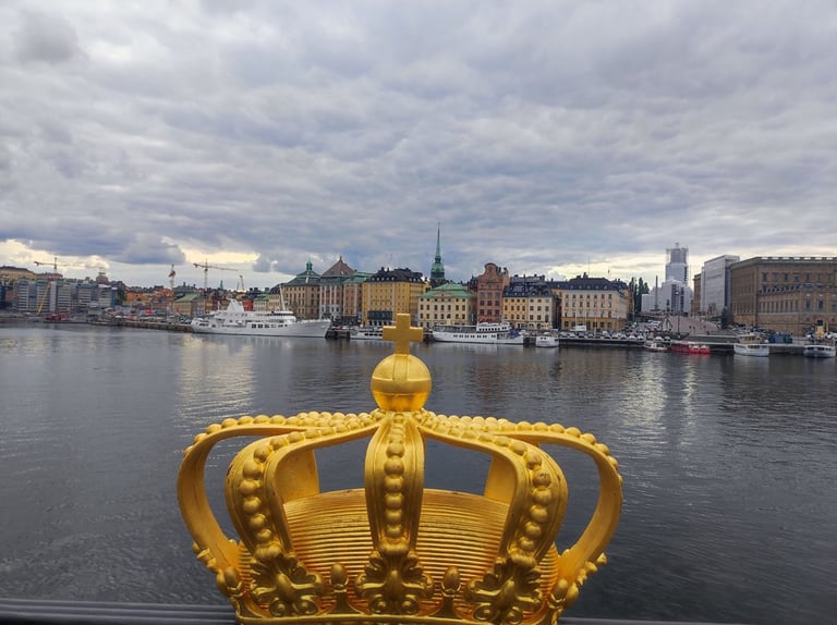 Today we sleep in again and then take the train to Stockholm Central, where we buy our breakfast. We then head towards Drottninggatan, the big shopping street, where we first enjoy our breakfast. Then we browse through various shops and Annina buys a few souvenirs. We walk on towards Gamla Stan, the old town, where we eat our Indian food from last night. When we walk to the Royal Palace it is two o'clock in the afternoon and by chance we see the changing of the guard. Later, we visit a few more shops and cross the Skeppsholmsbron bridge, where we see the Gilded Crown.