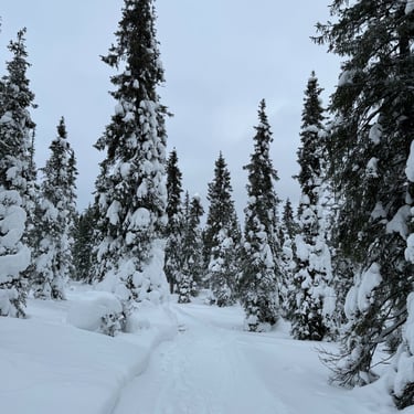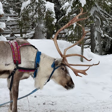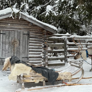 Das Frühstück gibt es im Haupthaus, es ist ein sehr leckeres Buffet mit allem, was man sich wünscht. Danach nutzen wir die wenigen Tagesstunden und leihen uns Schneeschuhe aus. Es gibt direkt von der Hütte startend ein paar Schneeschuhtrails und, wie wir nachher noch herausfinden, auch eine Loipe und Schneemobil Trails. Wir stapfen durch dicht verschneite Wälder und kommen an einer Rentier- & Huskyfarm vorbei. Die Hunde sind alle ganz aufgeregt, wenn sie einen Schlitten ziehen dürfen und die Rentiere liegen gemütlich in ihren Ställen. Wir machen aber noch keine Hundeschlittentour, das kommt hoffentlich noch an einem anderen Tag.